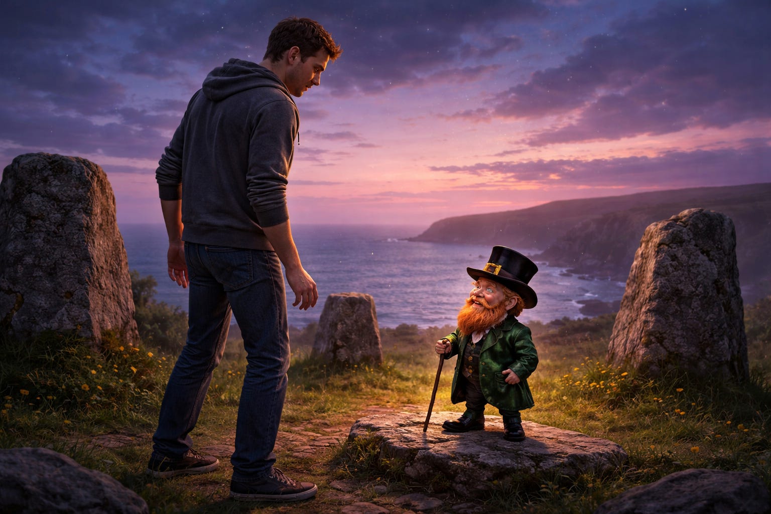 A small man sat on one of the stones with his legs crossed and his hands folded on one knee. He wore a green coat too well tailored to be comic, black boots polished to a military gleam, and a hat that looked less folkloric than rakish.